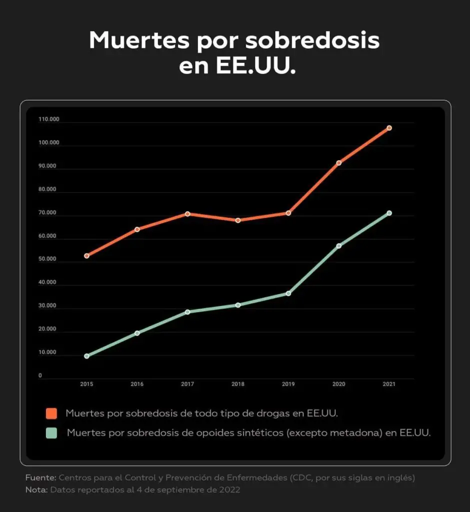 El año pasado esta sustancia fue responsable de más de un 66 % de las muertes por sobredosis en la Unión Americana. A este ritmo, cuando acabe 2022 por lo menos 7 de cada 10 muertes por sobredosis estarán asociadas al consumo de este opioide sintético.